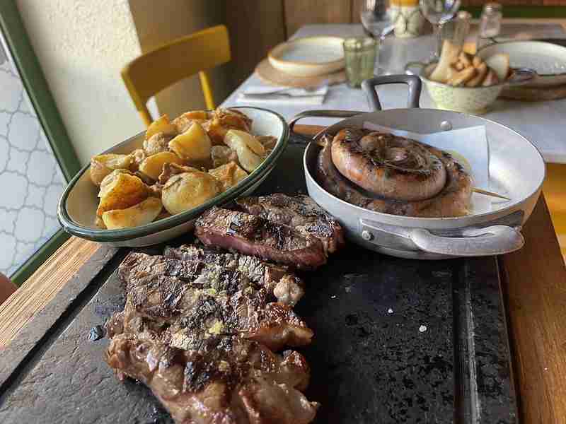 Mi az, ami nálunk az asztalra került? Hummusz, kolbász, krumpli, velőscsont és tatár bifsztek – szóval minden, ami kell egy kiadós, húsimádó lakomához. Nyilván minden frissen készül, talán a krumpli nem volt annyira a helyzet magaslatán, de a husik igen.