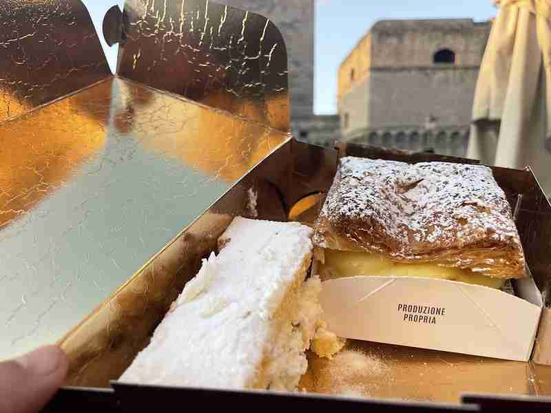 Az olaszok többsége fagyizott, mi leveles tésztás süteményt és ricottás–pisztáciás tortát ettünk. Mindkettő pontos, letisztult, öröm. Ha a bari vár környékén jársz, ezt a sarkon megbújó helyet írd fel. Még januárban is sor kígyózott előtte, szóval erre számíts!